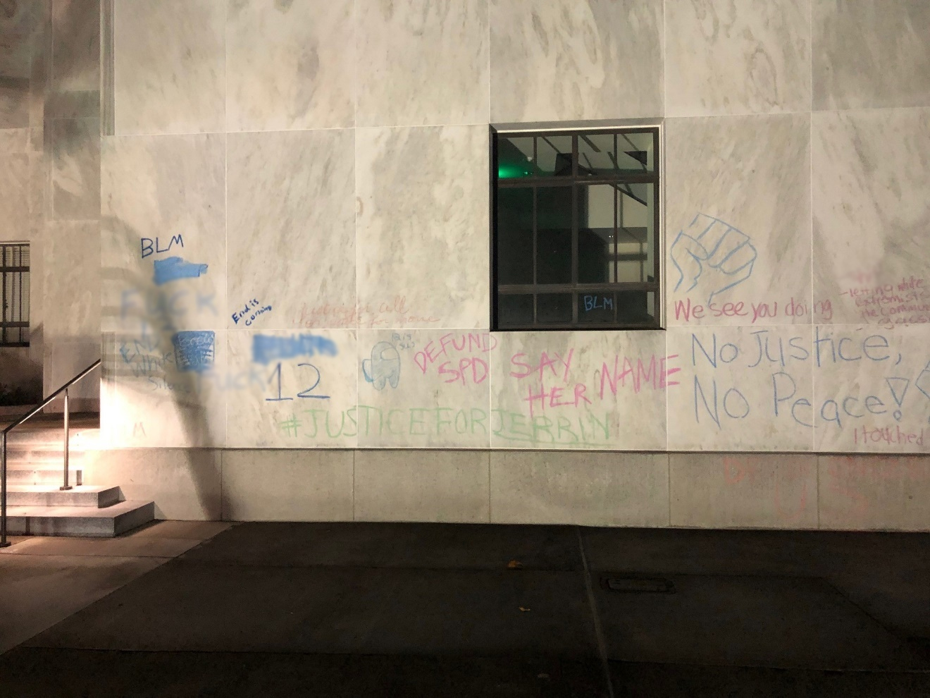Anti-graffiti coatings are intended to act as a barrier to help prevent paint or marker from being absorbed into the porous substrate, and to make graffiti removal easier. The preservation industry in general is wary of applying clear coatings to historic masonry, which include both anti-graffiti coatings and water repellents. While there are similarities between these two types of coatings, the biggest difference is the underlying chemistry: most non-sacrificial graffiti control treatments can also be used for water repellency, but not all water repellents provide graffiti resistance. According to product literature, both are generally formulated to be vapor permeable, but the concern is that these types of coatings could in fact reduce vapor transmission occurring in the historic masonry assembly. This reduction in vapor transmission could trap moisture within the stone and lead to stone deterioration, including sugaring and spalling. Coatings may also alter the appearance of the stone, in both color and sheen. Damage from coatings on historic masonry is a well-documented condition and can be seen on many historic buildings in the Pacific Northwest.