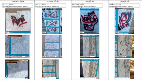 In general, both the sacrificial and non-sacrificial coatings performed well as far as appearance and ease of graffiti removal. Listed below are the pros and cons of both types of products.