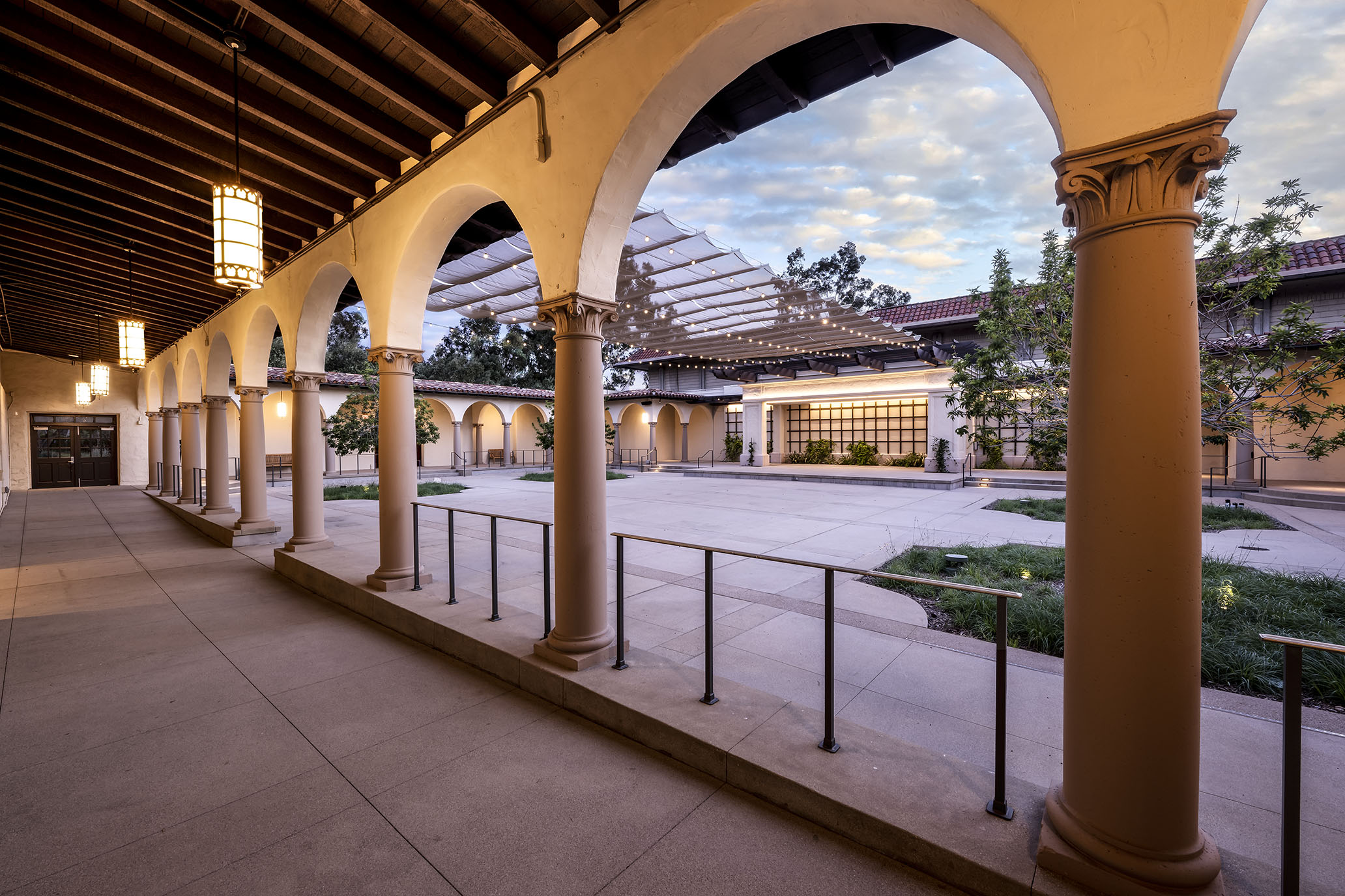 The pavilion design is architecturally compatible with Hunt’s Italian Renaissance Revival style and allows for a variety of events such as weddings, student activities, and screenings. A full-length retractable canopy that spans 94 feet across and 30 feet wide along with the shade sail operation were the biggest challenges in the design. Festoon lights lie between the canopies, designed in concert with the sail cloths. As the Taylor Pool before it, Cannon Plaza is an enduring amenity to Occidental College as a flexible and beautiful space.