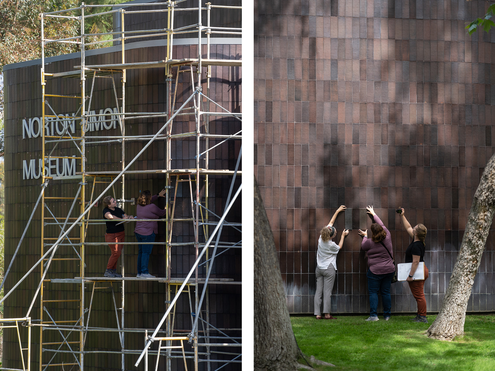 The Norton Simon Museum building features distinctive, modern, curvilinear walls which are clad with glazed tiles in earthen hues. The tile was designed by Edith Heath of Heath Ceramics. It is dual-glazed with red over onyx, which provides a range of mottled brown, red and purple shades that are reminiscent of the “coppery plum-colored shadows” of the nearby San Gabriel Mountains from which the artist took inspiration. The tiles provide a delightful handcrafted quality to the modern forms, and the color shifts throughout the day with changing light conditions.