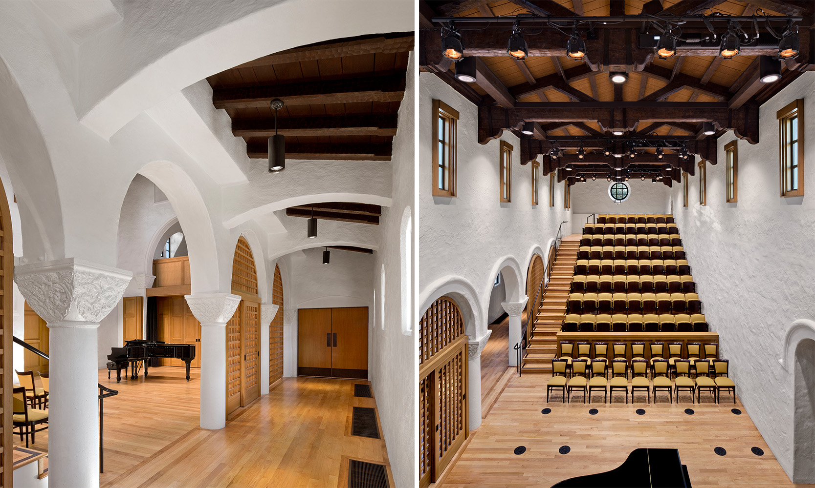 The first phase of improvements, completed in early 2015, included the adaptive reuse of the existing chapel into a two-story Recital Hall, along with site infrastructure, access, and parking lot improvements to immediately start unifying the campus. The Recital Hall provides a signature performance space for the Conservatory, with a mix of fixed seating on risers and movable chairs, balanced acoustics, and up-to-date sound and lighting systems.