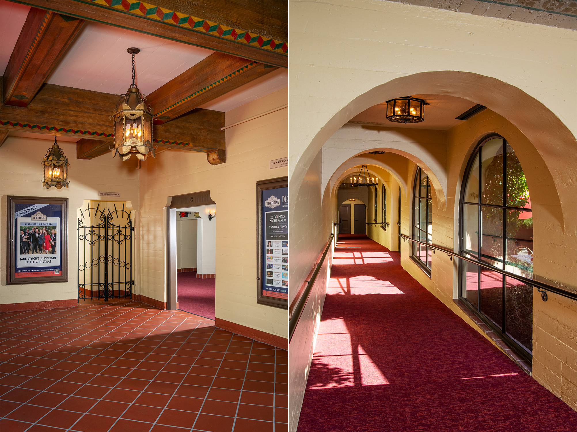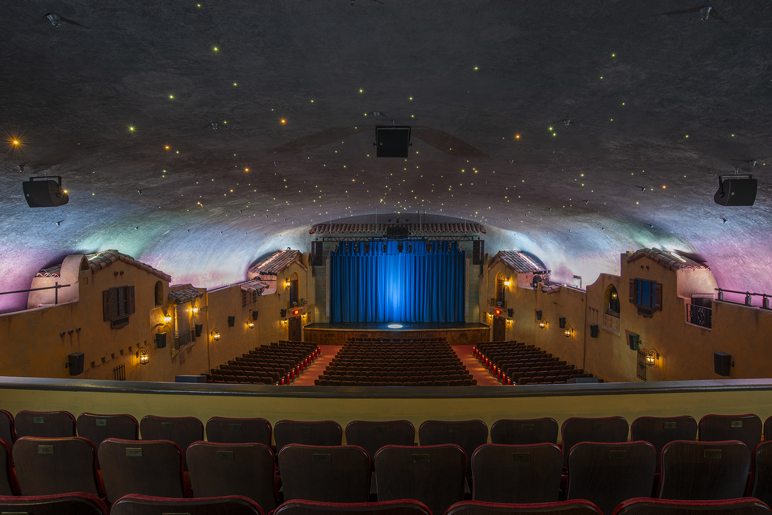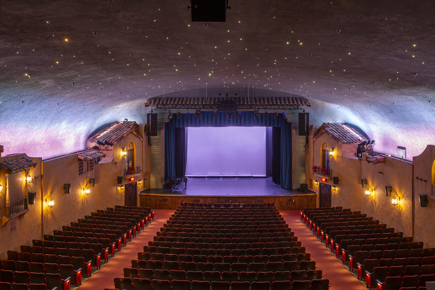The Plaza Theatre is a historic performing arts venue in the heart of Downtown Palm Springs, CA. Originally commissioned by Julia Carnell and designed by architect Harry Williams, the theater is a cornerstone of the La Plaza complex, one of the first commercial shopping centers of its kind when it opened in 1936. The decorative auditorium interior evokes an evening village scene in a Spanish Colonial Revival style, a rare surviving example of an atmospheric theater. The Plaza Theatre played a major role in contributing to the cultural fabric of the Coachella Valley for over nine decades, hosting a variety of film premieres, radio shows, and live acts including The Fabulous Palm Springs Follies musical revue. In 1991, the Plaza Theatre was designated as a Class 1 Historic property by the City of Palm Springs Historic Site Preservation Board. The theater was closed in 2014, leaving the beloved building’s future uncertain.